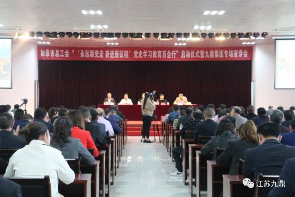 4月22日下午,如皋市總工會“‘永遠跟黨走 奮進新征程’黨史學習教育百企行”啟動儀式在九鼎集團召開。市委常委、組織部部長朱瑩瀅,市總工會黨組書記、主席周太榮,各鎮(區、街道)專職會主席、工會工作者,納入百企行企業工會主席,黨史教育宣講團,九鼎集團黨員職工代表等參加了啟動儀式。儀式由市總工會黨組副書記、副書記許益飛主持。